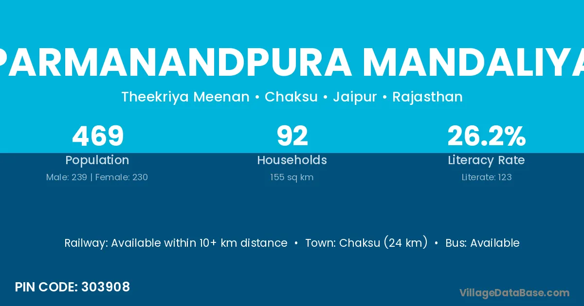 Chaksu (24 km) is the nearest town to Parmanandpura Mandaliya village for major economic activities and is located approximately 24 km away.