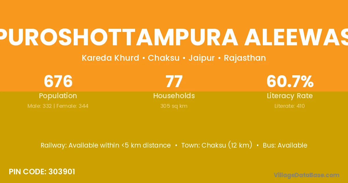 Chaksu (12 km) is the nearest town to Puroshottampura Aleewas village for major economic activities and is located approximately 12 km away.