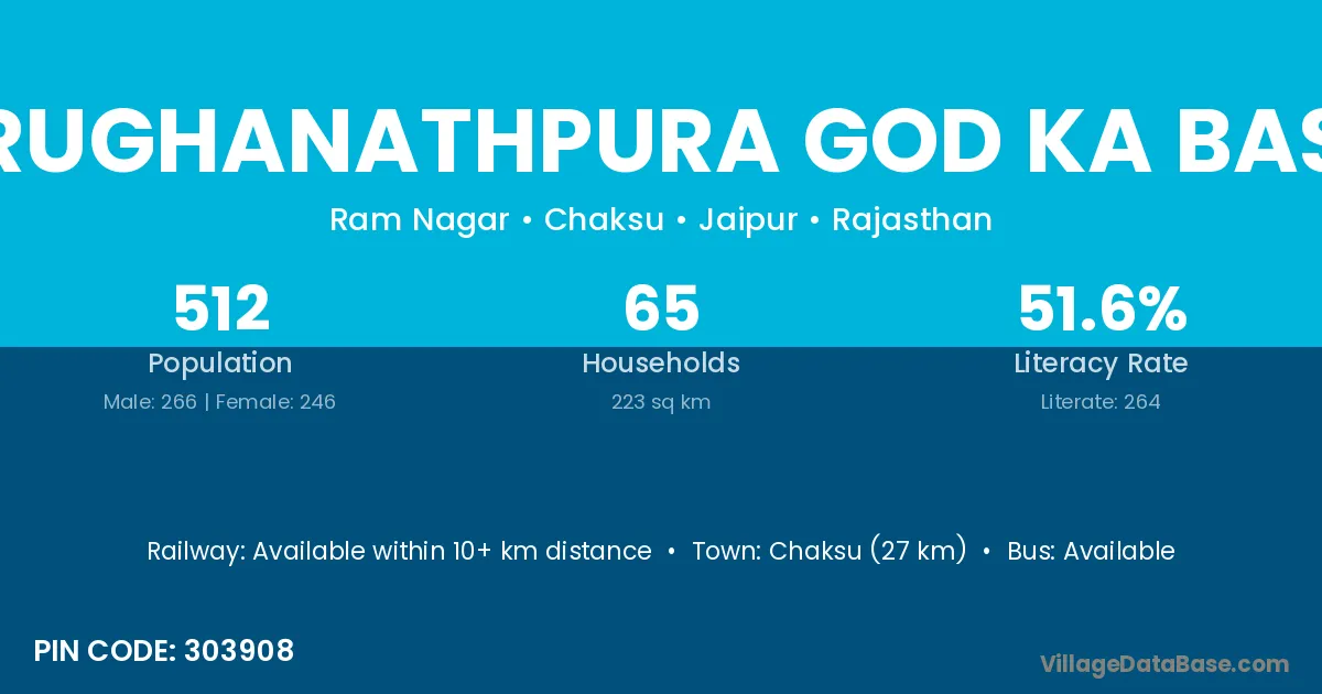 Chaksu (27 km) is the nearest town to Rughanathpura God Ka Bas village for major economic activities and is located approximately 27 km away.