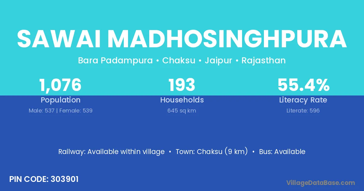 Sawai Madhosinghpura village has a total population of 1,076 people, of which 537 are males and 539 are females.