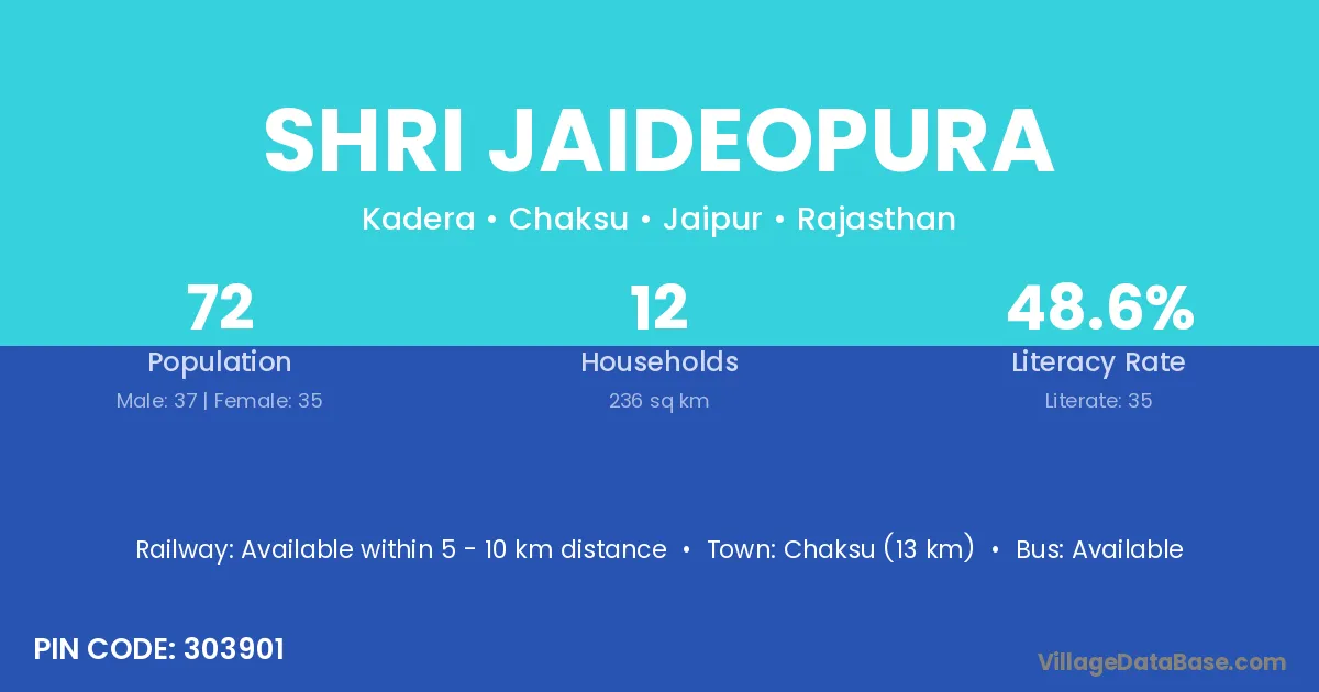 Chaksu (13 km) is the nearest town to Shri Jaideopura village for major economic activities and is located approximately 13 km away.
