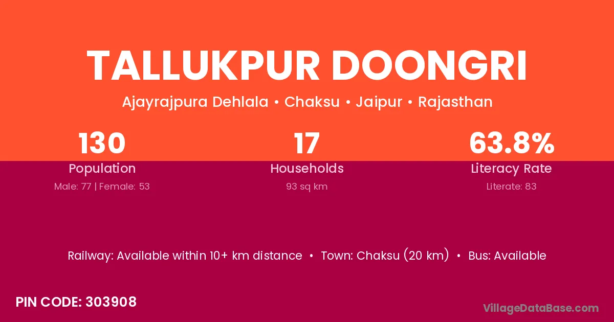 Chaksu (20 km) is the nearest town to Tallukpur Doongri village for major economic activities and is located approximately 20 km away.