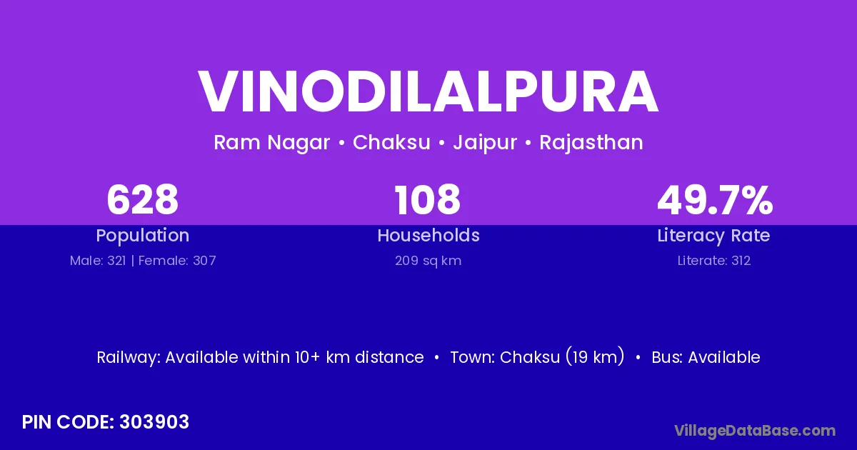 Chaksu (19 km) is the nearest town to Vinodilalpura village for major economic activities and is located approximately 19 km away.
