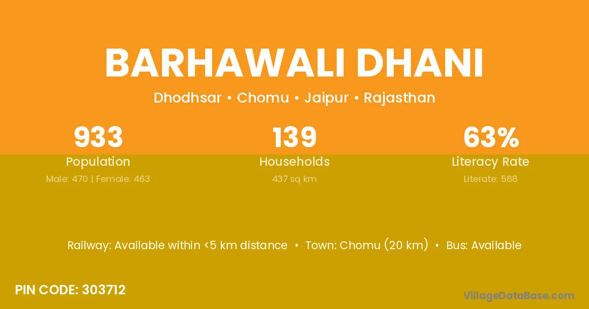 Barhawali Dhani village has a total population of 933 people, of which 470 are males and 463 are females.