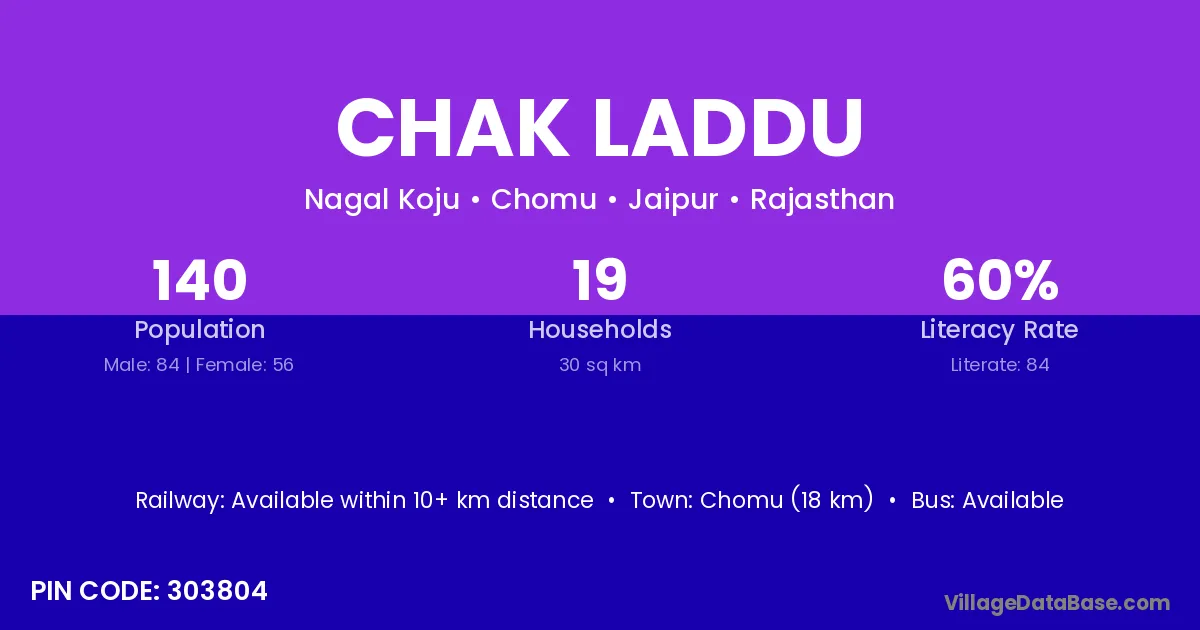 Chomu (18 km) is the nearest town to Chak Laddu village for major economic activities and is located approximately 18 km away.