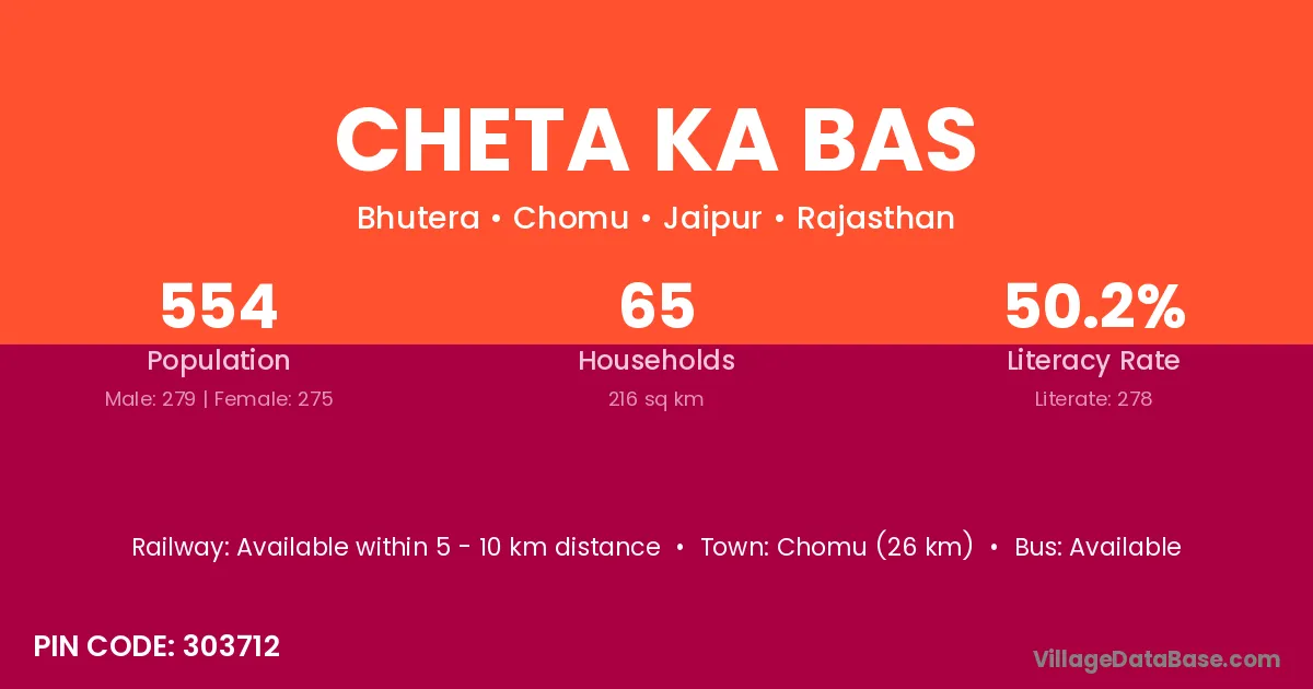 Cheta Ka Bas village has a total population of 554 people, of which 279 are males and 275 are females.