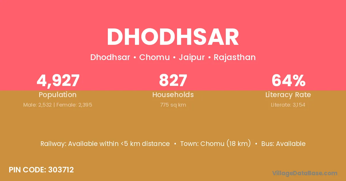 Chomu (18 km) is the nearest town to Dhodhsar village for major economic activities and is located approximately 18 km away.