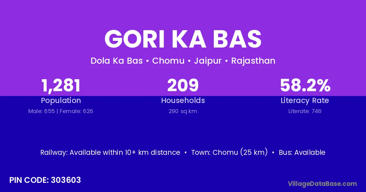 Chomu (25 km) is the nearest town to Gori Ka Bas village for major economic activities and is located approximately 25 km away.