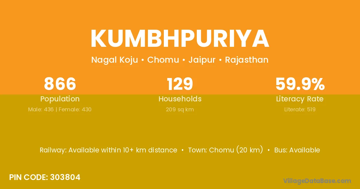 Chomu (20 km) is the nearest town to Kumbhpuriya village for major economic activities and is located approximately 20 km away.