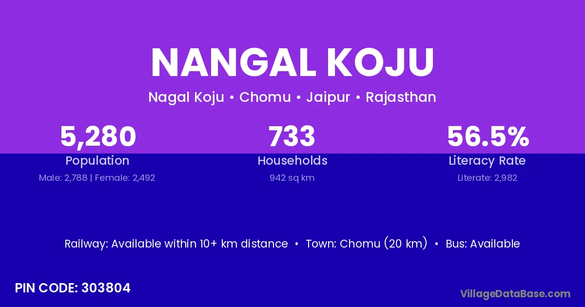 Chomu (20 km) is the nearest town to Nangal Koju village for major economic activities and is located approximately 20 km away.