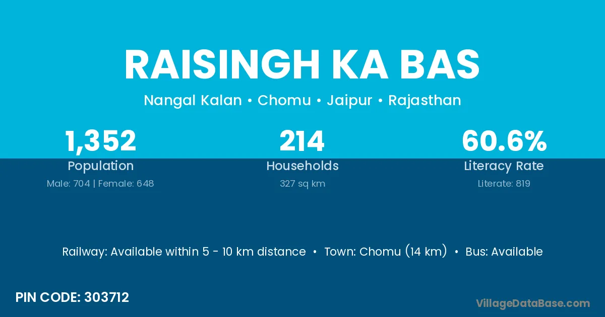 Chomu (14 km) is the nearest town to Raisingh Ka Bas village for major economic activities and is located approximately 14 km away.