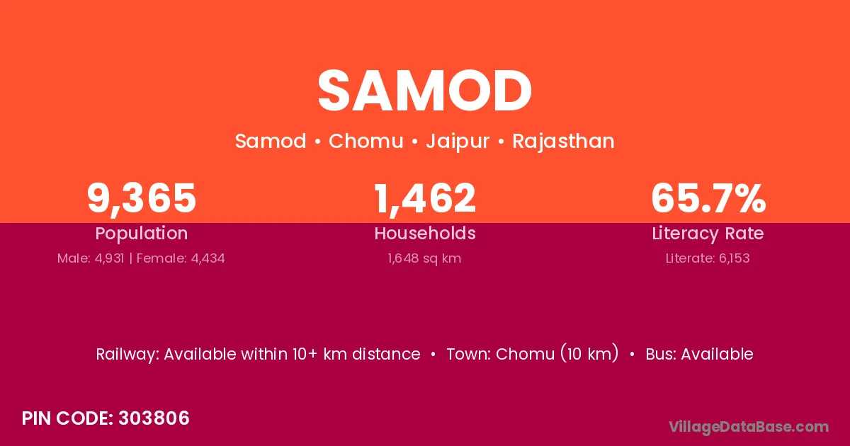 Chomu (10 km) is the nearest town to Samod village for major economic activities and is located approximately 10 km away.