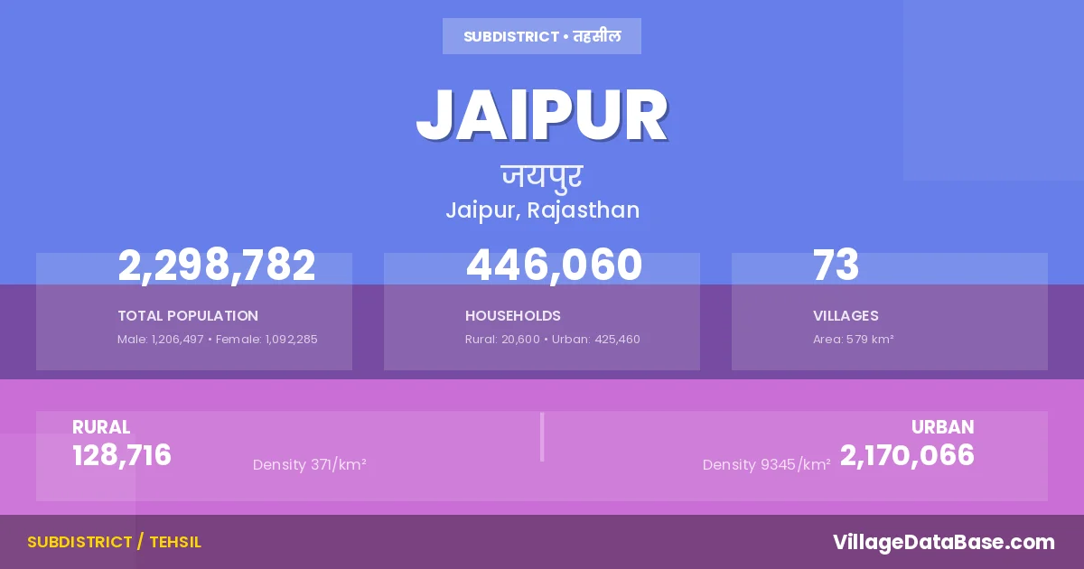 According to the 2011 census The total area of Jaipur Tehsil is 579 km², with a population of 2298782 people. The population density is 3,969 inhabitants per square kilometre, and there are approximately 446060 houses in the sub district.