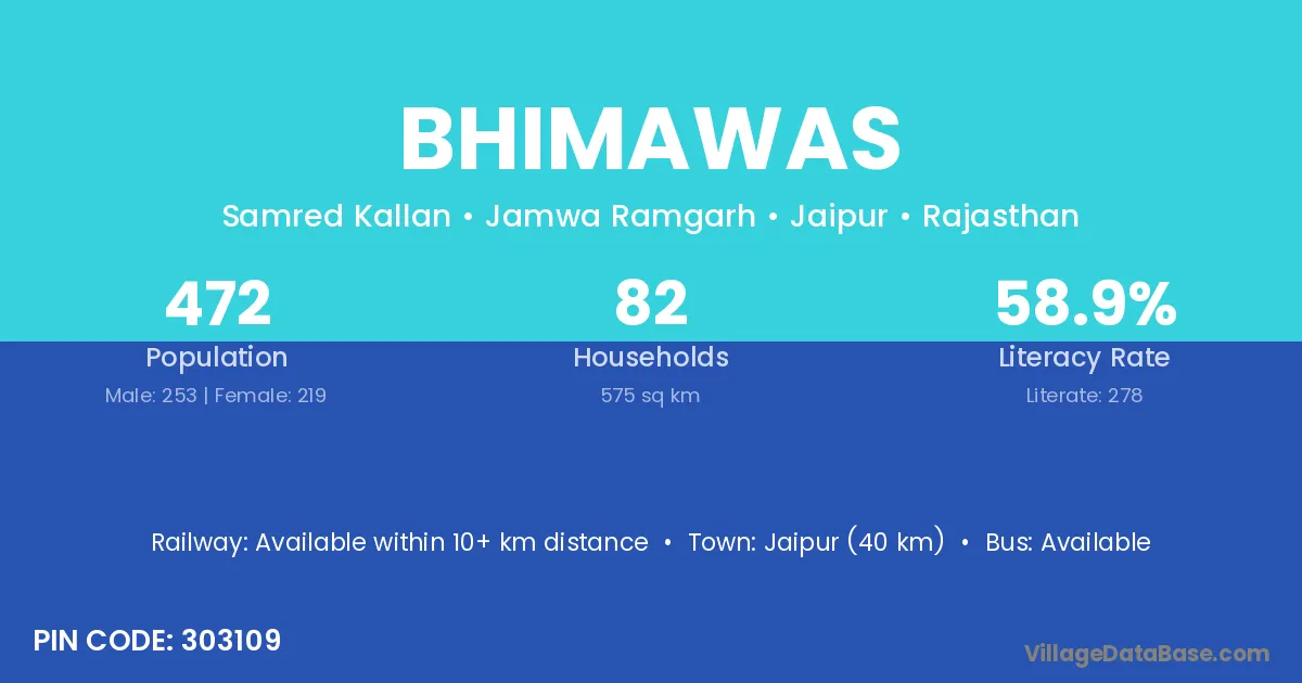 Bhimawas village has a total population of 472 people, of which 253 are males and 219 are females.