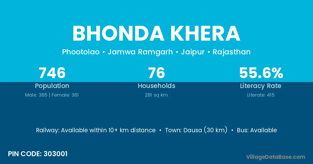 Dausa (30 km) is the nearest town to Bhonda Khera village for major economic activities and is located approximately 30 km away.