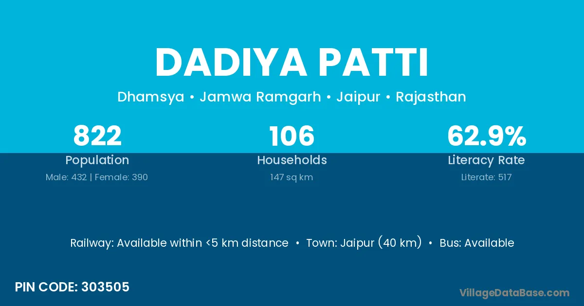 Jaipur (40 km) is the nearest town to Dadiya Patti village for major economic activities and is located approximately 40 km away.