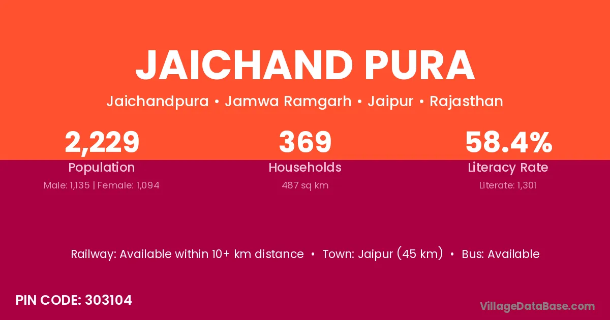 Jaipur (45 km) is the nearest town to Jaichand Pura village for major economic activities and is located approximately 45 km away.