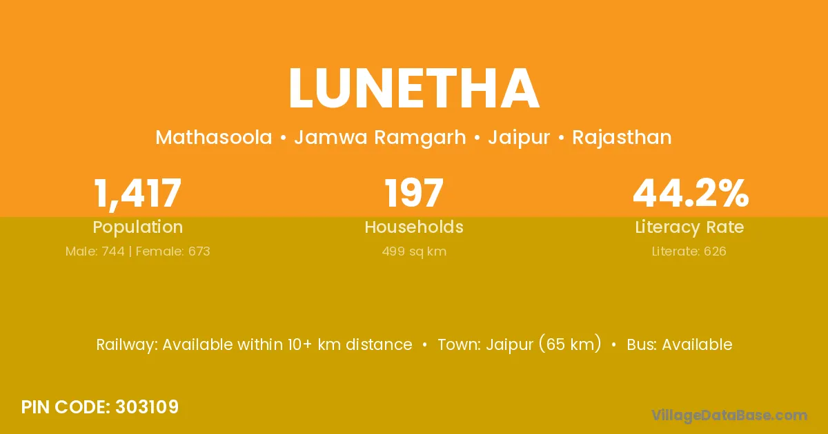Jaipur (65 km) is the nearest town to Lunetha village for major economic activities and is located approximately 65 km away.