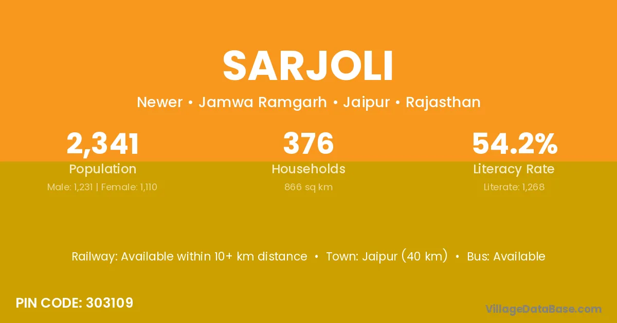 Jaipur (40 km) is the nearest town to Sarjoli village for major economic activities and is located approximately 40 km away.