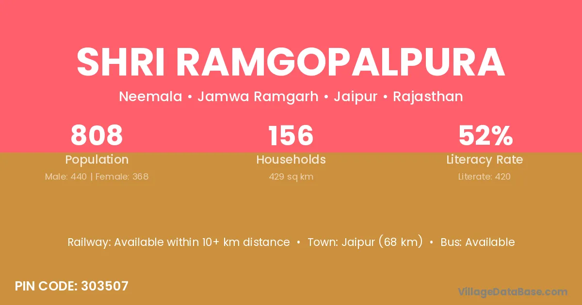 Jaipur (68 km) is the nearest town to Shri Ramgopalpura village for major economic activities and is located approximately 68 km away.