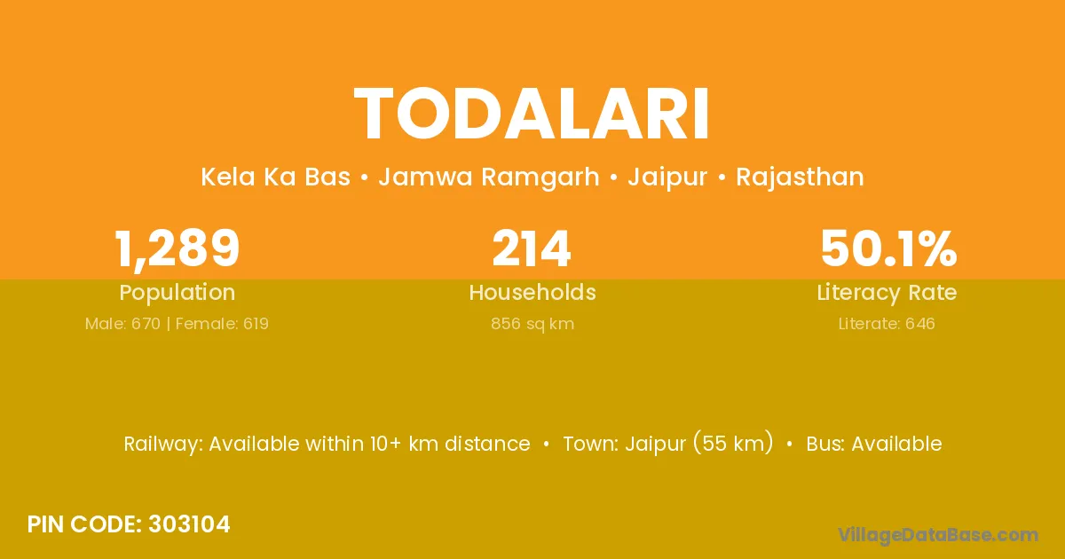 Jaipur (55 km) is the nearest town to Todalari village for major economic activities and is located approximately 55 km away.