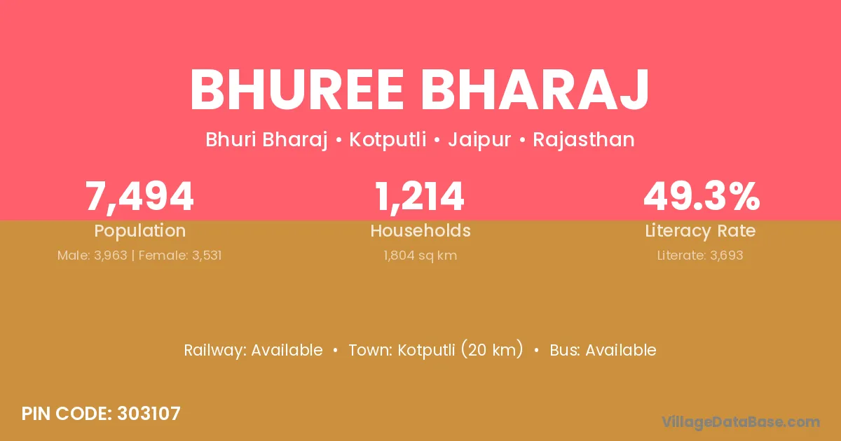 Kotputli (20 km) is the nearest town to Bhuree Bharaj village for major economic activities and is located approximately 20 km away.