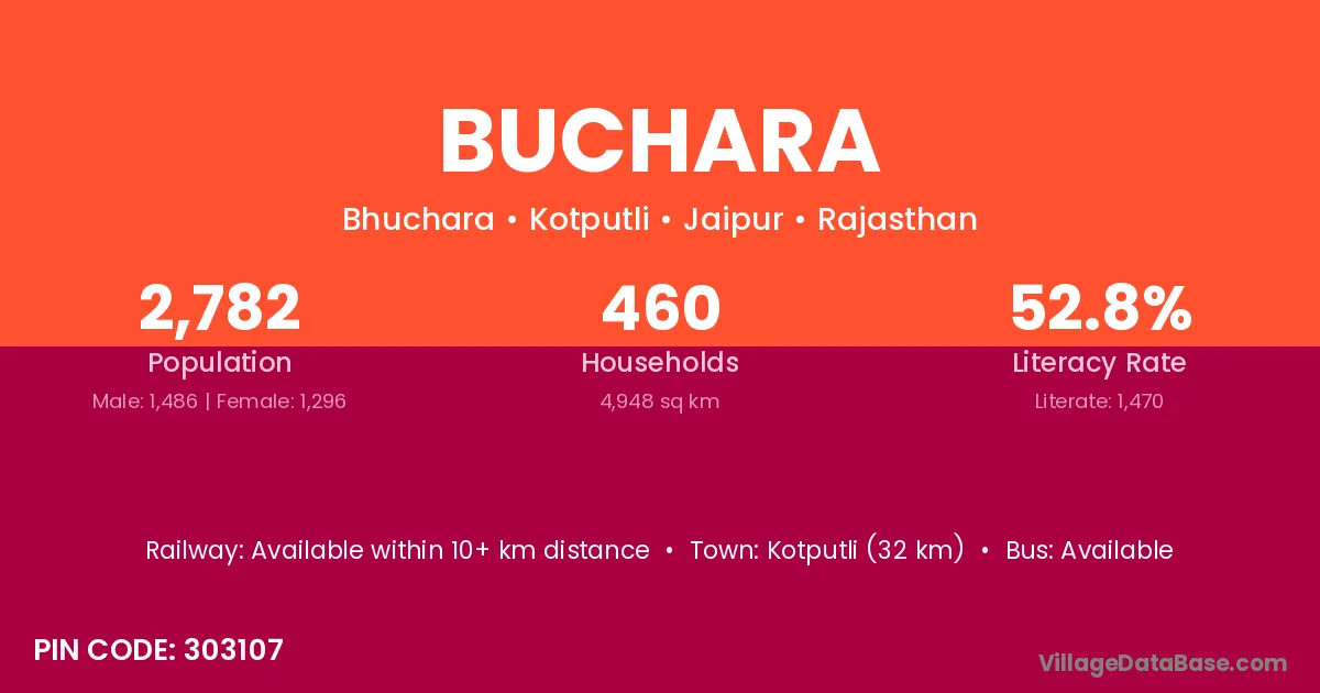Kotputli (32 km) is the nearest town to Buchara village for major economic activities and is located approximately 32 km away.