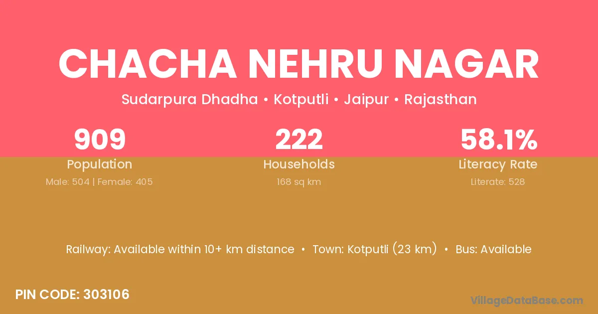 Kotputli (23 km) is the nearest town to Chacha Nehru Nagar village for major economic activities and is located approximately 23 km away.