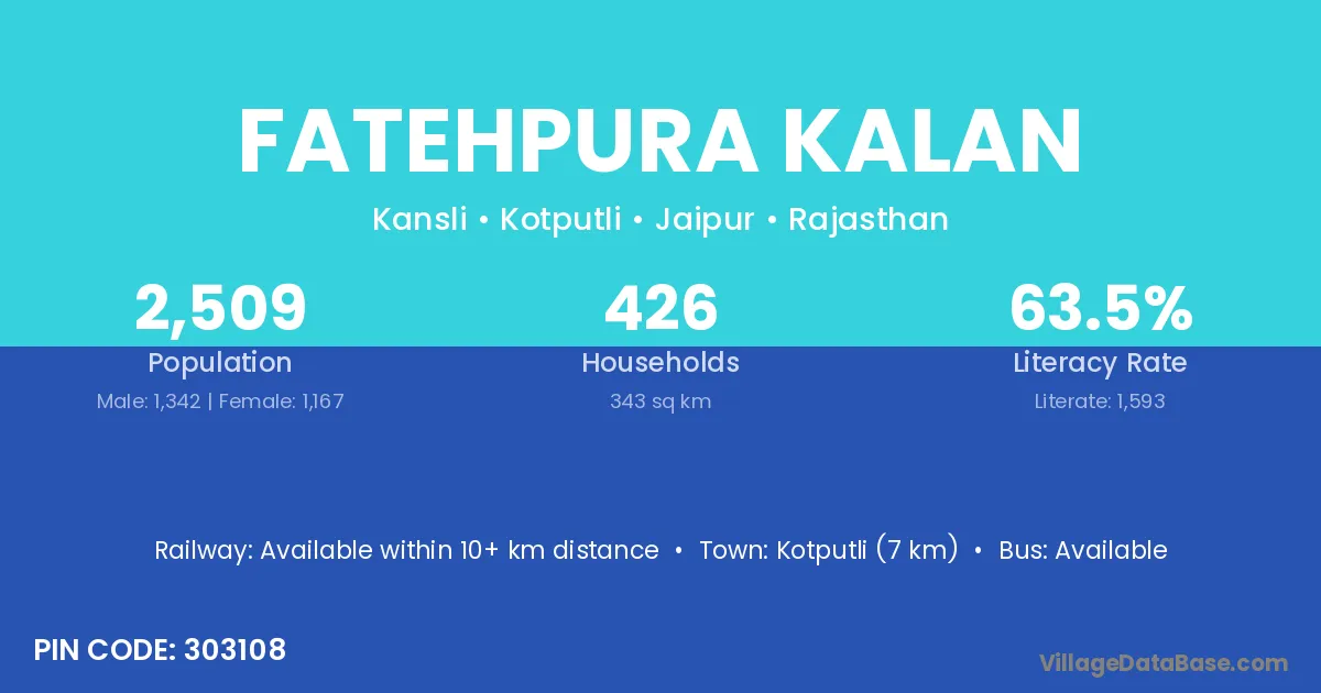 Kotputli (7 km) is the nearest town to Fatehpura Kalan village for major economic activities and is located approximately 7 km away.
