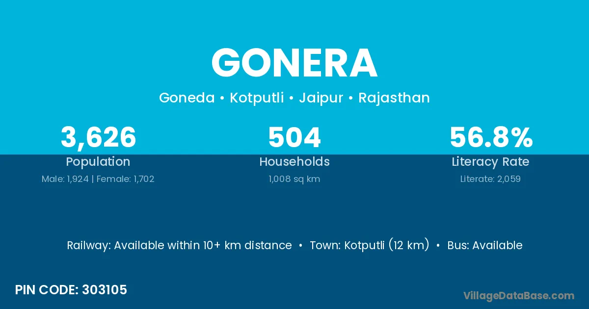 Kotputli (12 km) is the nearest town to Gonera village for major economic activities and is located approximately 12 km away.