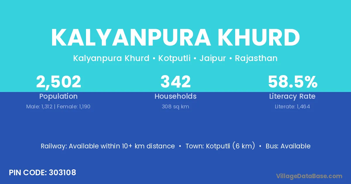 Kotputli (6 km) is the nearest town to Kalyanpura Khurd village for major economic activities and is located approximately 6 km away.