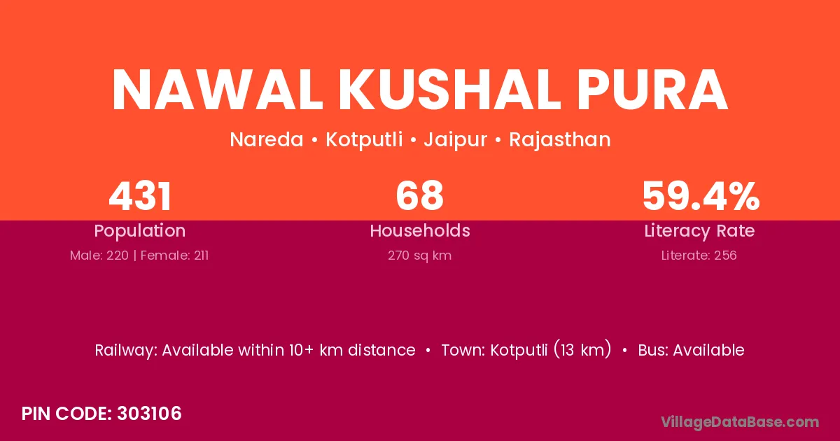 Nawal Kushal Pura village has a total population of 431 people, of which 220 are males and 211 are females.