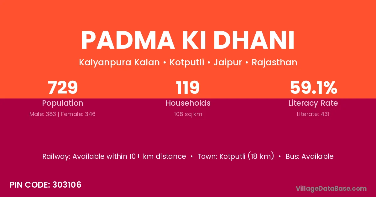 Kotputli (18 km) is the nearest town to Padma Ki Dhani village for major economic activities and is located approximately 18 km away.