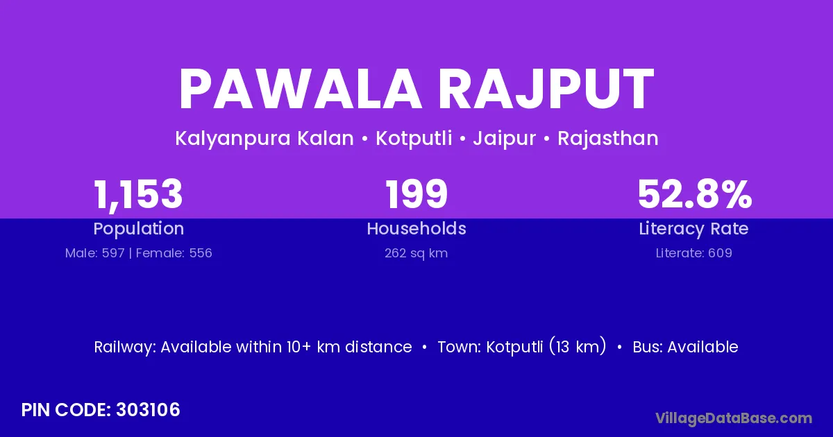 Kotputli (13 km) is the nearest town to Pawala Rajput village for major economic activities and is located approximately 13 km away.