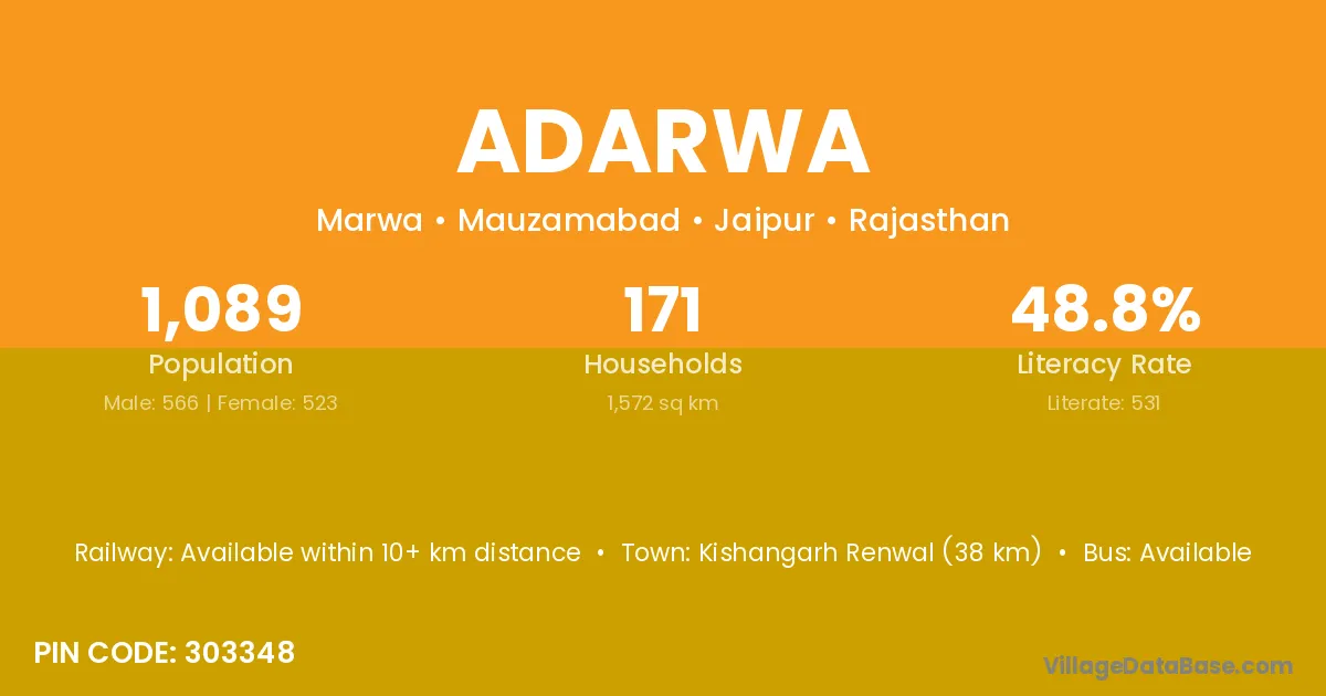 Kishangarh Renwal (38 km) is the nearest town to Adarwa village for major economic activities and is located approximately 38 km away.
