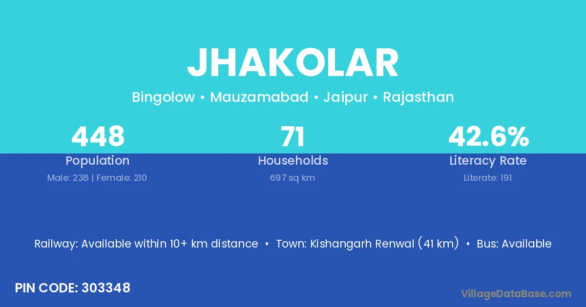 Kishangarh Renwal (41 km) is the nearest town to Jhakolar village for major economic activities and is located approximately 41 km away.