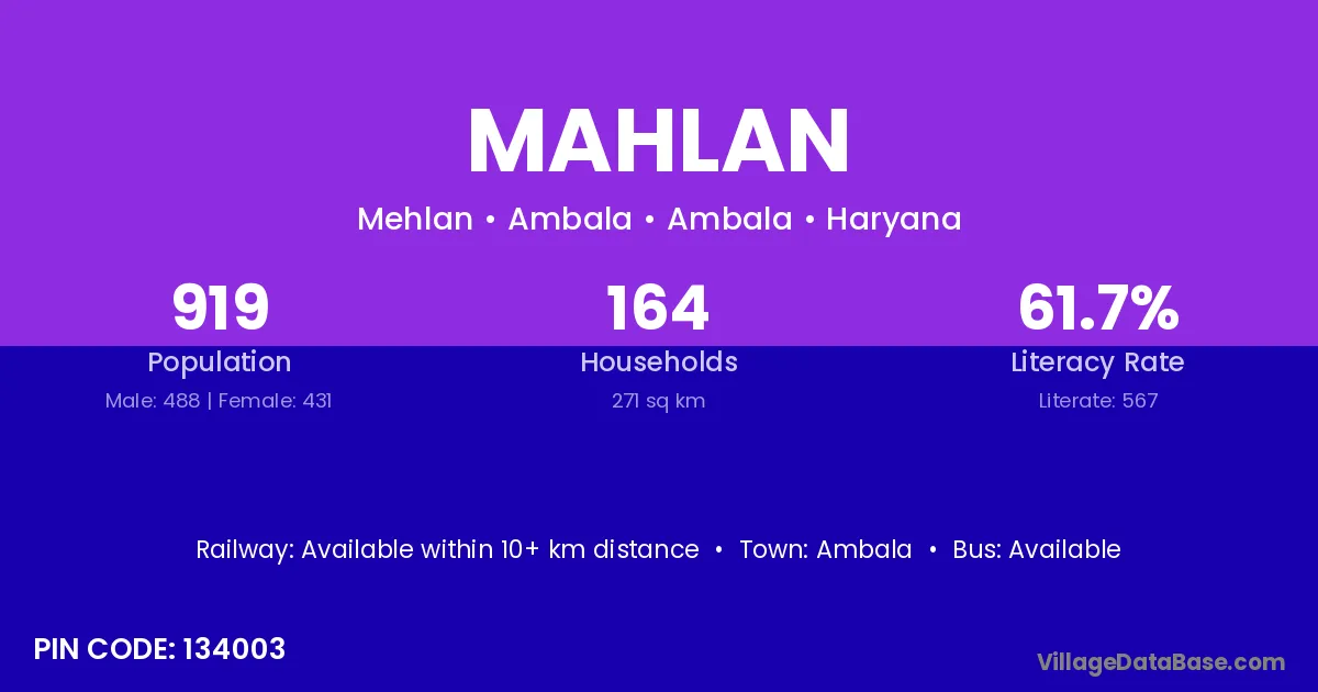The literacy rate of Mahlan village is 61.82%. Male literacy stands at 73.48% and female literacy at 49.07%.