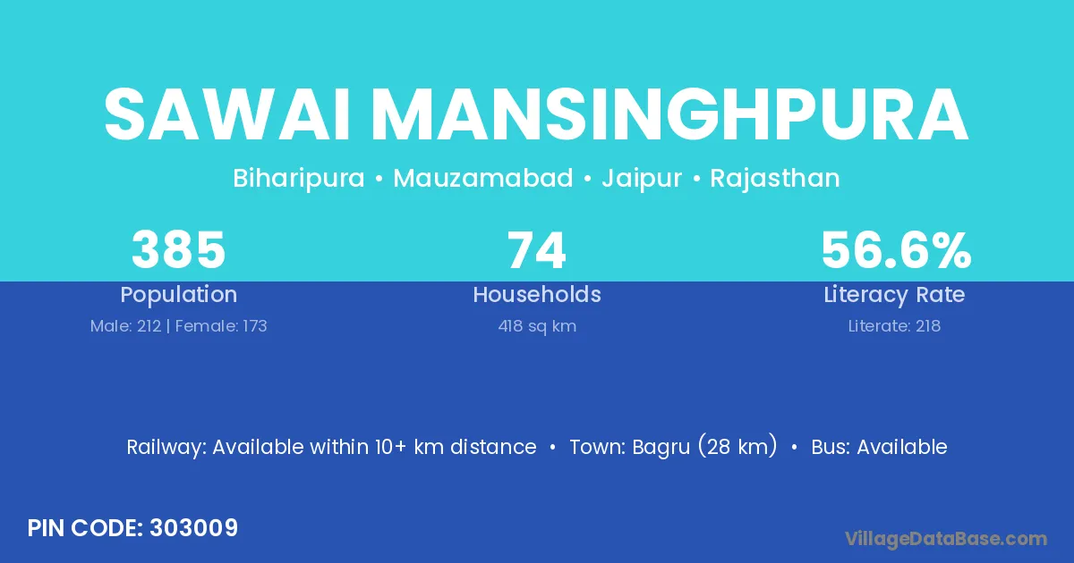 Sawai Mansinghpura village has a total population of 385 people, of which 212 are males and 173 are females.