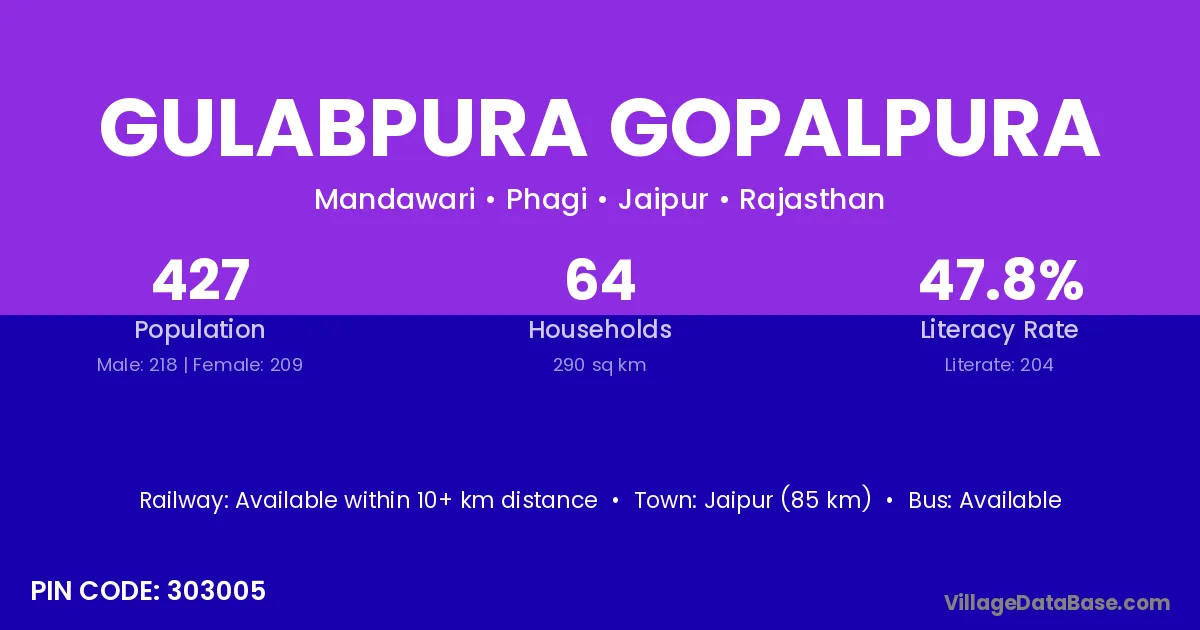 Gulabpura Gopalpura village has a total population of 427 people, of which 218 are males and 209 are females.