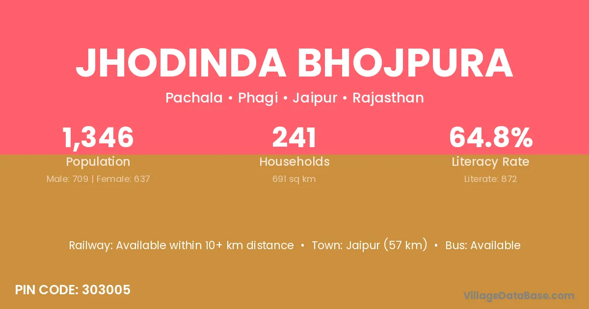 Jaipur (57 km) is the nearest town to Jhodinda Bhojpura village for major economic activities and is located approximately 57 km away.