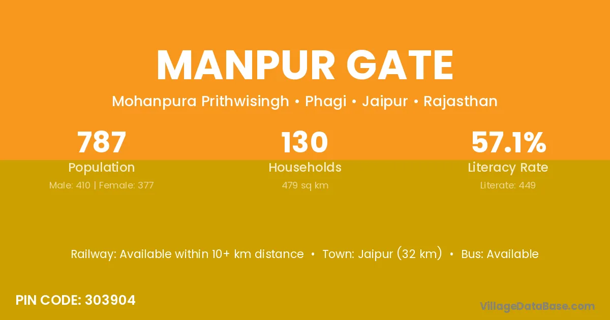 Jaipur (32 km) is the nearest town to Manpur Gate village for major economic activities and is located approximately 32 km away.