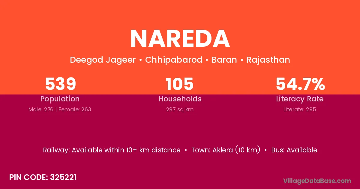 Jaipur (65 km) is the nearest town to Nareda village for major economic activities and is located approximately 65 km away.