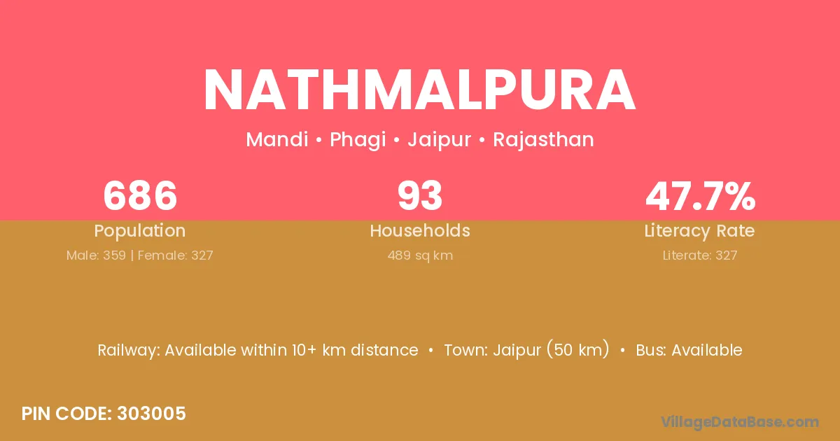 Jaipur (50 km) is the nearest town to Nathmalpura village for major economic activities and is located approximately 50 km away.