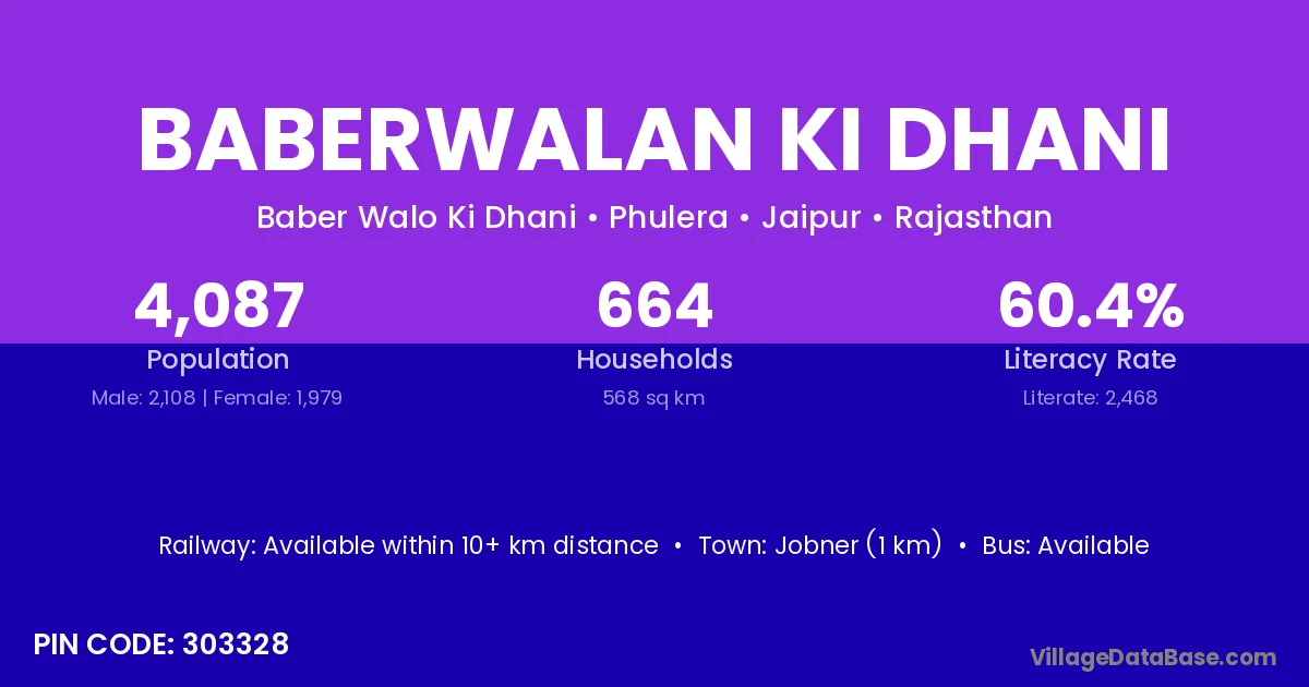 Jobner (1 km) is the nearest town to Baberwalan Ki Dhani village for major economic activities and is located approximately 1 km away.