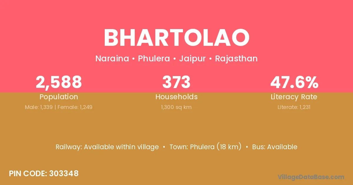 Phulera (18 km) is the nearest town to Bhartolao village for major economic activities and is located approximately 18 km away.