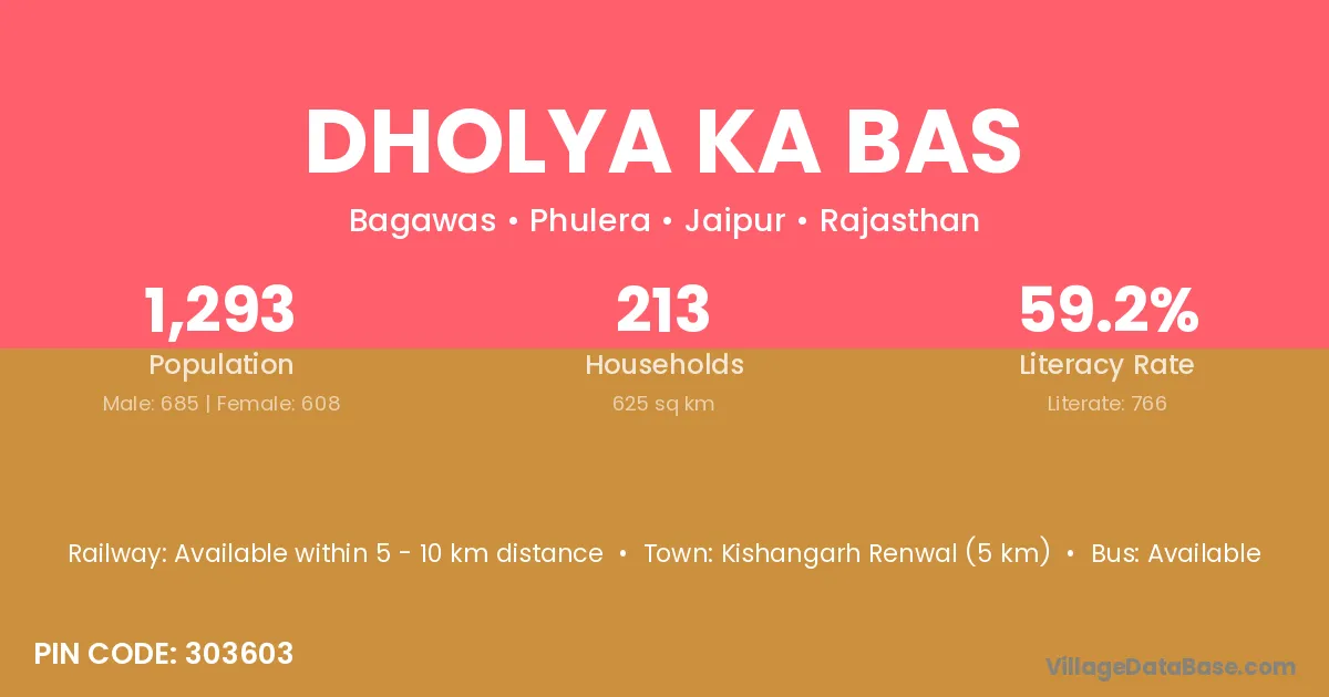 Dholya Ka Bas village has a total population of 1,293 people, of which 685 are males and 608 are females.