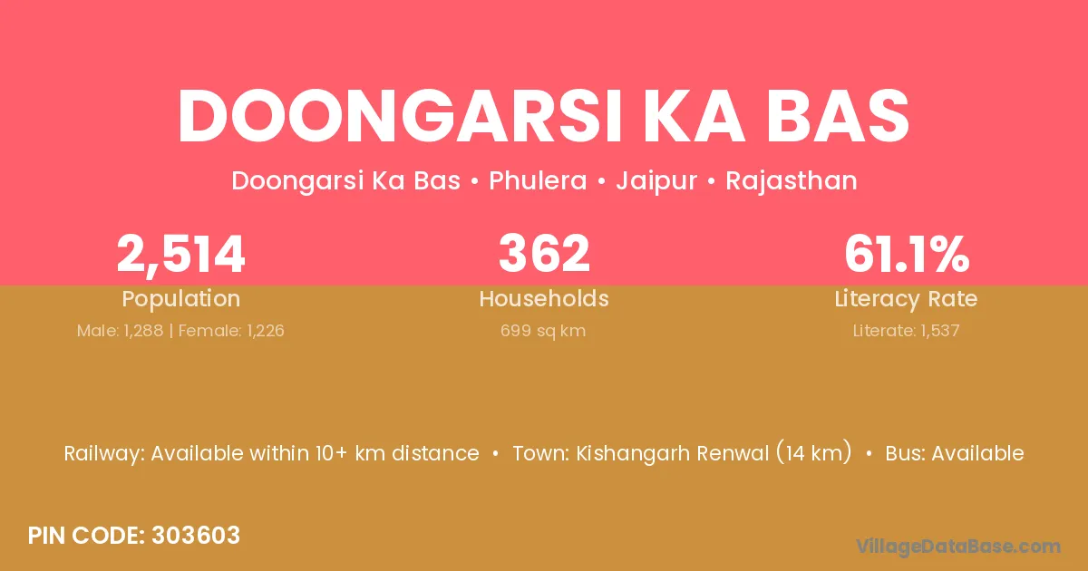 Kishangarh Renwal (14 km) is the nearest town to Doongarsi Ka Bas village for major economic activities and is located approximately 14 km away.