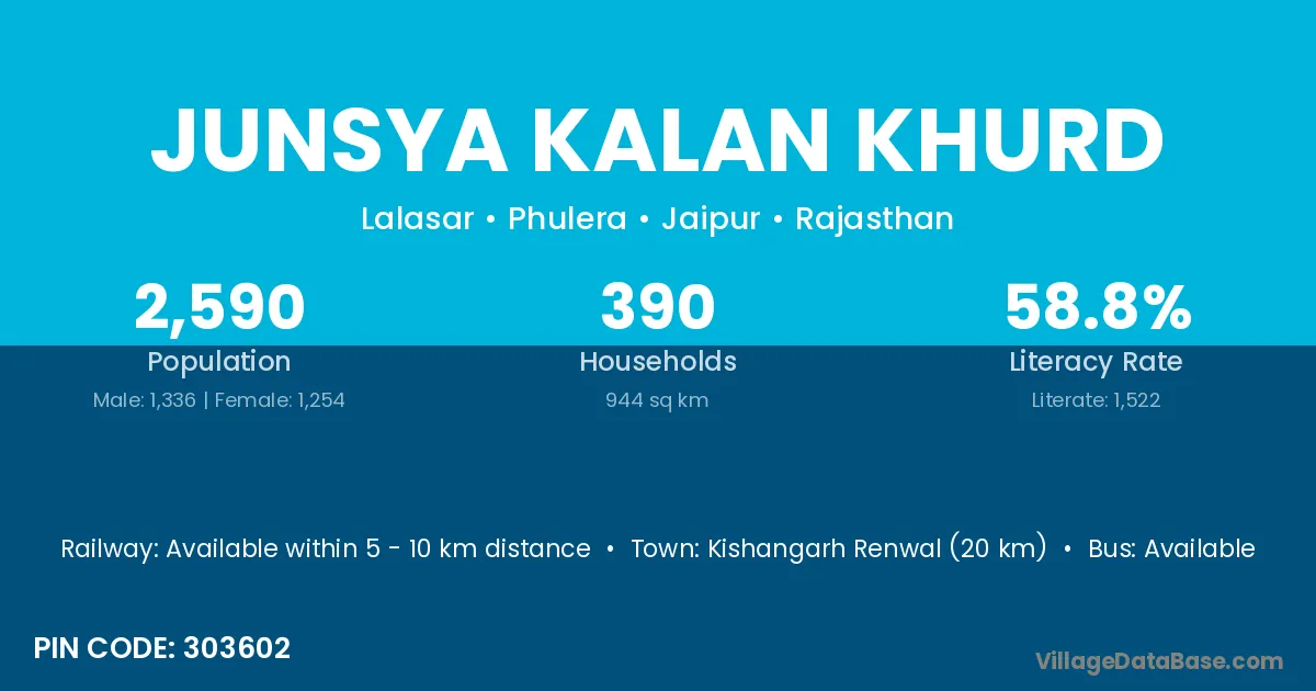Kishangarh Renwal (20 km) is the nearest town to Junsya Kalan Khurd village for major economic activities and is located approximately 20 km away.