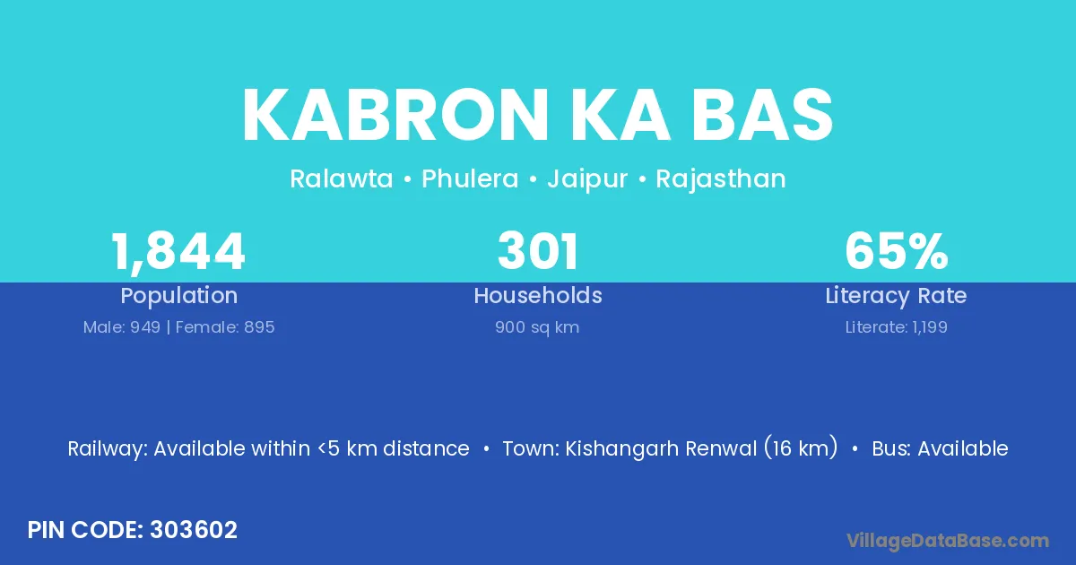 Kishangarh Renwal (16 km) is the nearest town to Kabron Ka Bas village for major economic activities and is located approximately 16 km away.