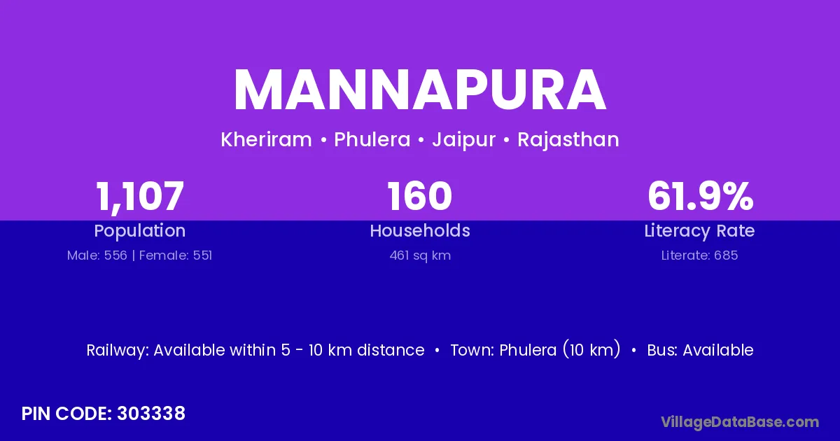 Phulera (10 km) is the nearest town to Mannapura village for major economic activities and is located approximately 10 km away.